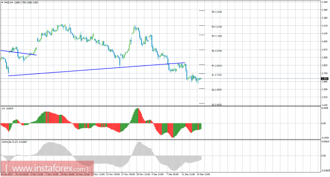 Технический анализ природного газа за 15 декабря 2017 годаИнстаФорекс - Instaforex, 7 лет назад 4-часовой таймфрейм Анализ: Цена на природный газ в четверг, 14 декабря, продолжала располагаться ниже уровня поддержки S1 и понемногу начала двигаться вниз. Цели для движения вниз – уровни поддержки 2,5970 и 2,4520. Оба индикатора развернулись наверх, начав, таким образом, разряжаться. Нисходящей линии тренда на данный момент по-прежнему нет. Запасы газа по данным Министерства Энергетики за минувшую неделю сократились. Торговые рекомендации: По инструменту #NG сейчас рекомендуется рассматривать шорты с целями 2,5970 и 2,4520. Стоп-лосс выставляется выше ближайшего уровня сопротивления. Рекомендуется выставить Stop Loss в зону безубытка при прибыльности сделки 800-1000 пунктов. Разворот вниз одного или обоих индикаторов может указать на продолжение движения вниз. На сегодня нет запланированных публикаций, касающихся газа. Ордера на покупку потеряли свою актуальность. Помимо технической картины следует также учитывать фундаментальные данные и время их выхода. Пояснения к иллюстрациям: Awesome Oscillator – красные и зеленые бары в окне индикаторов. OsMA – серые бары в окне индикаторов. Линии тренда – синие линии. Уровни поддержки и сопротивления – красные горизонтальные линии.Материал предоставлен компанией InstaForex - www.instaforex.com |