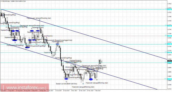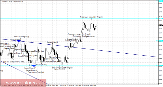Свечной анализ NZD/USD на 18 декабряИнстаФорекс - Instaforex, 7 лет назад 4h Пара NZD/USD на 4-часовом графике, после образования медвежьей свечной формации «Падающая звезда», выполнила разворот в пользу доллара США и начала падение в направлении коррекционного уровня 161,8% - 0,6937. Образование 18 декабря бычьей свечной формации позволит трейдерам ожидать разворот в пользу валюты Новой Зеландии и возобновление роста в направлении уровня коррекции 127,2% - 0,7043. Закрепление курса пары над уровнем коррекции 127,2% повысит вероятность продолжения роста в направлении следующего уровня Фибо 100,0% - 0,7127. Сетка Фибо построена по экстремумам от 31 августа 2017 года и 20 сентября 2017 года. Daily На 24-часовом графике процесс роста котировок продолжается, пара выполнила закрепление над уровнем коррекции 76,4% - 0,6992. Таким образом, процесс роста может быть продолжен в направлении следующего уровня Фибо 61,8% - 0,7100. Образование медвежьей формации позволит ожидать разворот пары в пользу американской валюты и некоторое падение. Такая формация будет идентифицирована как трендовая, исходя из направления равноудаленного канала «вниз». Закрепление курса под уровнем коррекции 76,4% аналогично сработает в пользу падения котировок в направлении уровня Фибо 100,0% - 0,6818. Сетка Фибо построена по экстремумам от 11 мая 2017 года и 27 июля 2017 года. Материал предоставлен компанией InstaForex - www.instaforex.com |