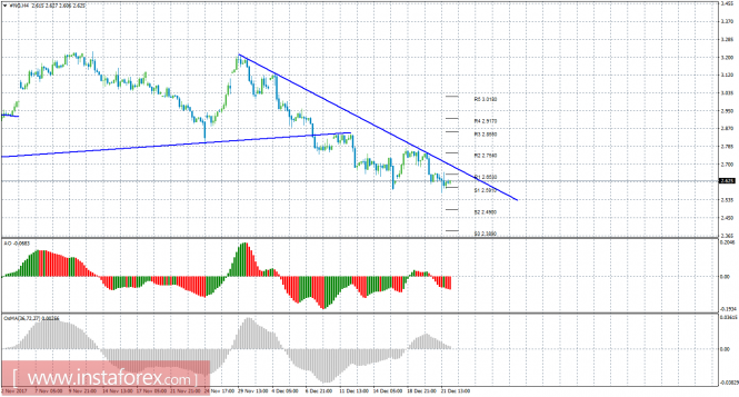 Технический анализ природного газа за 22 декабря 2017 годаИнстаФорекс - Instaforex, 7 лет назад 4-часовой таймфрейм Анализ: Цена на природный газ в четверг, 21 декабря, продолжала движение вниз и отработала уровень поддержки S1, согласно нисходящей тенденции, в которой находится инструмент. Новая нисходящая линия тренда поддерживает торгующих на понижение и делает актуальными шорты. При этом следует отметить, что эта линия тренда довольно слабая и цена без особого труда может закрепиться выше нее в ближайшие дни. Но пока сохраняется нисходящая тенденция, о чем также сигнализируют оба индикатора. Торговые рекомендации: По инструменту #NG сейчас рекомендуется рассматривать шорты с целями 2,4900 и 2,3890. Стоп-лосс выставляется выше ближайшего уровня сопротивления. Рекомендуется выставить Stop Loss в зону безубытка при прибыльности сделки 800-1000 пунктов. Разворот наверх Awesome или OsMA может указать на виток восходящей коррекции. На сегодня нет запланированных публикаций, касающихся газа. Ордера на покупку сейчас не актуальны. Помимо технической картины следует также учитывать фундаментальные данные и время их выхода. Пояснения к иллюстрациям: Awesome Oscillator – красные и зеленые бары в окне индикаторов. OsMA – серые бары в окне индикаторов. Линии тренда – синие линии. Уровни поддержки и сопротивления – красные горизонтальные линии.Материал предоставлен компанией InstaForex - www.instaforex.com |