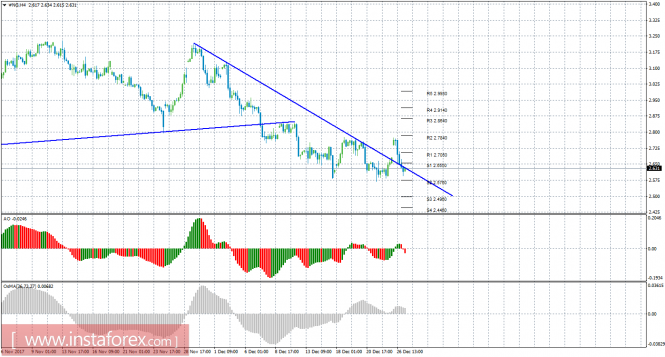 Технический анализ природного газа за 27 декабря 2017 годаИнстаФорекс - Instaforex, 7 лет назад 4-часовой таймфрейм Анализ: Цена на природный газ в среду, 27 декабря, начала довольно сильную коррекцию, а нисходящая тенденция, которая была нарушена преодолением нисходящей линии тренда, может восстановиться. Но пока что все же более вероятность движение вверх, но после завершения текущей коррекции. Если цена преодолеет последний локальный минимум, то это будет означать возобновление нисходящего, а линия тренда будет перестроена. В сложившейся ситуации лучше всего будет подождать развития событий. Торговые рекомендации: По инструменту #NG сейчас рекомендуется рассматривать лонги с целями 2,7840 и 2,8640. Стоп-лосс выставляется ниже ближайшего уровня поддержки. Рекомендуется выставить Stop Loss в зону безубытка при прибыльности сделки 800-1000 пунктов. Разворот наверх Awesome или OsMA может указать на окончание нисходящей коррекции, как и закрепление выше уровня 2,6550. На сегодня нет запланированных публикаций, касающихся газа. Ордера на продажу пока что не актуальны. Помимо технической картины следует также учитывать фундаментальные данные и время их выхода. Пояснения к иллюстрациям: Awesome Oscillator – красные и зеленые бары в окне индикаторов. OsMA – серые бары в окне индикаторов. Линии тренда – синие линии. Уровни поддержки и сопротивления – красные горизонтальные линии.Материал предоставлен компанией InstaForex - www.instaforex.com |