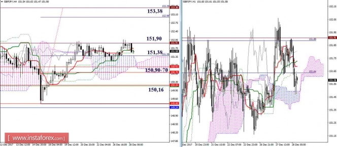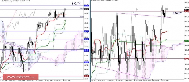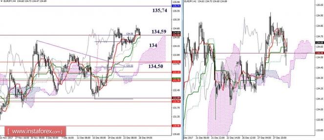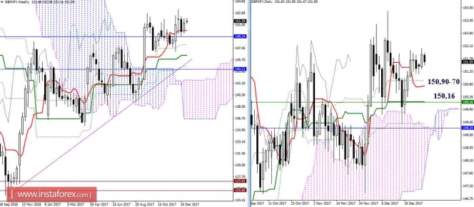 Дневной обзор GBP/JPY и EUR/JPY на 28.12.17. Индикатор ИшимокуИнстаФорекс - Instaforex, 7 лет назад GBP/JPY Вчера игроки на повышение предприняли попытку продолжить начатое на прошлой неделе, но достичь надёжного результата пока не удалось. Возврат к поддержкам (150,90-70 (дневной Фибо Киджун + дневной Тенкан) + 150,16 (дневной Киджун + недельный Тенкан)), а тем более закрепление под ними может надолго изменить ситуацию и приоритеты в движении. Игрокам на повышение не удаётся преодолеть ключевое сопротивление (151,90 цель Н1 + исторический уровень), поэтому последующие повышательные ориентиры (цель Н4 + максимальный экстремум 153,38) пока не актуальны. Поддержки сегодня расположены на прежних уровнях – 151,38 (облака Н4 и Н1), 150,90-70 (дневной Фибо Киджун + дневной Тенкан + нижняя граница облака Н4) и 150,16 (дневной Киджун + недельный Тенкан). EUR/JPY Игроки на повышение сохраняют надежду на то, что им удастся справиться с сопротивлением и притяжением 134,59 (уровень 100% недельной цели). После прохождения данного уровня их ждёт тестирование верхней границы месячного облака (134,74). После длительного нахождения под уровнем пара пытается закрепиться выше 134,59. Следующим ориентиром для продолжения подъёма служит 135,74 (месячный Сенкоу Спан А). В случае неудачи, игроки на повышение достаточно быстро лишатся преимуществ на младших таймах, так как будут ликвидированы золотые кресты Н4 и Н1, а с пробоем облака Н1 появится понижательная цель, исполнение которой приведёт пару к поддержке облака Н4. Параметры индикатора: все временные интервалы 9 – 26 – 52 Цвет линий индикатора: Тенкан (краткосрочный тренд) – красный, Киджун (среднесрочный тренд) – зелёный, Фибо Киджун – зеленый пунктир, Чинкоу – серый, облака : Сенкоу Спан Б (SSB, долгосрочный тренд) – синий, Сенкоу Спан А (SSA) – розовый. Цвет дополнительных линий: поддержки и сопротивления MN – синий, W1 – зелёный, D1 – красный, Н4 – розовый, Н1 – серый, горизонтальные уровни (не Ишимоку) – коричневый, трендовые линии – фиолетовый. Материал предоставлен компанией InstaForex - www.instaforex.com |
