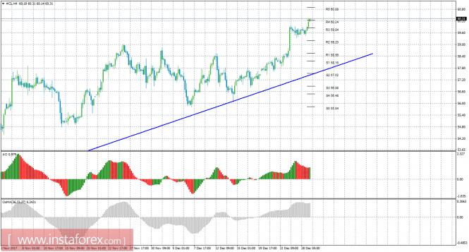 Технический анализ сырой нефти за 29 декабря 2017 годаИнстаФорекс - Instaforex, 7 лет назад 4-часовой таймфрейм Анализ: Котировки «черного золота» продолжали восходящее движение в четверг, 28 декабря, и отработали уровень сопротивления R4. Если цена преодолеет этот уровень, то последней актуальной целью останется уровень сопротивления 60,88. Восходящая линия тренда по-прежнему поддерживает торгующих на повышение и делает актуальными ордера на покупку. Индикатор Awesome может на текущем баре развернуться наверх, что подтвердит возобновление восходящего тренда. В целом оба индикатора в ближайшее время могут разряжаться, так как находятся на своих максимальных позициях. Отчет Министерства Энергетики США показал снижение объемов запасов сырой нефти за минувшую неделю на 4,6 миллиона баррелей. Торговые рекомендации: В ходе проведенного анализа движения цены на нефть, можно сделать вывод, что сейчас можно рассматривать ордера на покупку с целью 60,88. Стоп-лосс выставляем ниже ближайшего уровня поддержки. При заходе сделки в прибыльность 80-130 пунктов, рекомендуется переносить открытую сделку в безубыток. Преодоление уровня 60,24 укажет на продолжение движения вверх. На пятницу запланирован отчет Baker Hughes по изменению числа действующих буровых платформ (18-00 GMT). Короткие позиции сейчас по-прежнему не актуальны. Помимо технической картины следует также учитывать фундаментальные данные и время их выхода. Пояснения к иллюстрациям: Awesome Oscillator – красные и зеленые бары в окне индикаторов. OsMA – серые бары в окне индикаторов. Линии тренда – синие линии. Уровни поддержки и сопротивления – красные горизонтальные линии. Материал предоставлен компанией InstaForex - www.instaforex.com |