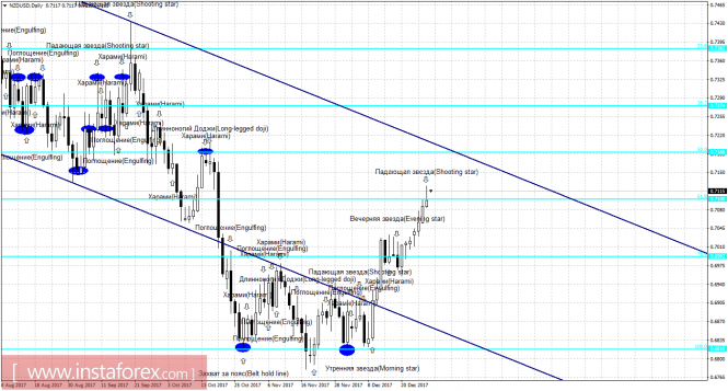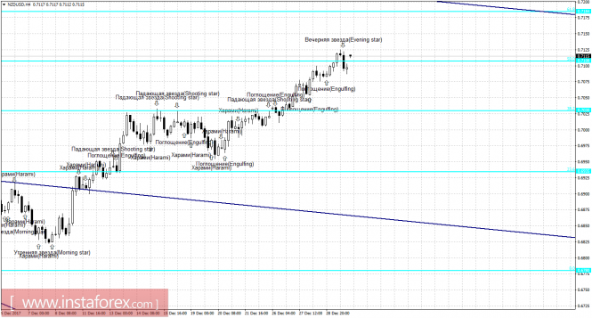 Свечной анализ NZD/USD на 2 январяИнстаФорекс - Instaforex, 7 лет назад 4h Пара NZD/USD на 4-часовом графике выполнила разворот в пользу валюты США после образования медвежьей формации «Вечерняя звезда», и закрепление под уровнем коррекции 50,0% - 0,7108. Однако новый 2018 год открылся над уровнем Фибо 50,0%. Таким образом, процесс роста может быть возобновлен в направлении коррекционного уровня 61,8% - 0,7184. Образование новой медвежьей формации вновь позволит ожидать разворот в пользу валюты США и некоторое падение котировок. Закрепление пары под уровнем Фибо 50,0% аналогично сработает в пользу начала падения в направлении коррекционного уровня 38,2% - 0,7030. Сетка Фибо построена по экстремумам от 31 августа 2017 года и 20 сентября 2017 года. Daily На 24-часовом графике котировки выполнили рост к коррекционному уровню 61,8% - 0,7100. Образование медвежьей формации будет трактоваться как трендовый сигнал, так как равноудаленный канал имеет направление «вниз», и позволит рассчитывать на разворот в пользу доллара США и некоторое падение котировок в направлении уровня Фибо 76,4% - 0,6992. Закрепление котировок над уровнем Фибо 61,8% повысит вероятность дальнейшего роста пары в направлении следующего уровня коррекции 50,0% - 0,7188. Сетка Фибо построена по экстремумам от 11 мая 2017 года и 27 июля 2017 года. Материал предоставлен компанией InstaForex - www.instaforex.com |