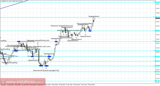 Свечной анализ EUR/JPY на 2 январяИнстаФорекс - Instaforex, 8 лет назад 4h Пара EUR/JPY на 4-часовом графике после отбоя от уровня коррекции 127,2% - 134,61 выполнила разворот в пользу евровалюты и рост к уровню Фибо 161,8% - 135,54. Медвежья формация «Харами» не позволила паре начать падение. Отбой котировок от уровня коррекции 161,8% сработает в пользу валюты Японии и начала падения в направлении коррекционного уровня 127,2%. Закрепление курса пары над уровнем коррекции 161,8% повысит вероятность дальнейшего роста в направлении следующего уровня Фибо 200,0% - 136,57. Сетка Фибо построена по экстремумам от 15 ноября 2017 года и 20 ноября 2017 года. Daily На 24-часовом графике бычья свечная формация «Три метода» позволила выполнить разворот в пользу валюты ЕС и возобновить рост в направлении коррекционного уровня 261,8% - 139,01. Образование медвежьей формации позволит трейдерам рассчитывать на новый разворот в пользу японской валюты и некоторое падение котировок в направлении уровня коррекции 200,0% - 133,32. Закрепление курса пары под уровнем Фибо 200,0% повысит шансы пары на продолжение падения в направлении следующего уровня коррекции 161,8% - 129,81. Сетка Фибо построена по экстремумам от 15 декабря 2016 года и 17 апреля 2017 года. Материал предоставлен компанией InstaForex - www.instaforex.com |