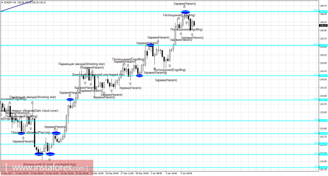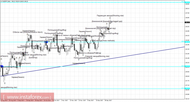 Свечной анализ EUR/JPY на 8 январяИнстаФорекс - Instaforex, 7 лет назад 4h Отбой котировок пары EUR/JPY на 4-часовом графике от уровня коррекции 200,0% - 136,57 и медвежья формация «Харами» сработали в пользу японской иены. Начался процесс падения в направлении коррекционного уровня 161,8% - 135,54. Бычья формация «Харами» позволяет рассчитывать на разворот уже в пользу евровалюты и возврат к уровню коррекции 200,0%. Закрепление курса пары над уровнем Фибо 200,0% повысит шансы на дальнейший рост в направлении следующего уровня коррекции 261,8% - 138,25. Сетка Фибо построена по экстремумам от 15 ноября 2017 года и 20 ноября 2017 года. Daily На 24-часовом графике рост котировок продолжается в направлении коррекционного уровня 261,8% - 139,01, после образования бычьей свечной формации «Поглощение». Образование медвежьей формации «Падающая звезда» позволяет трейдерам ожидать разворот в пользу японской валюты и некоторое падение котировок в направлении уровня Фибо 200,0% - 133,32. Проход парой пика «Звезды» сработает в пользу продолжения роста котировок. Сетка Фибо построена по экстремумам от 15 декабря 2016 года и 17 апреля 2017 года. Материал предоставлен компанией InstaForex - www.instaforex.com |