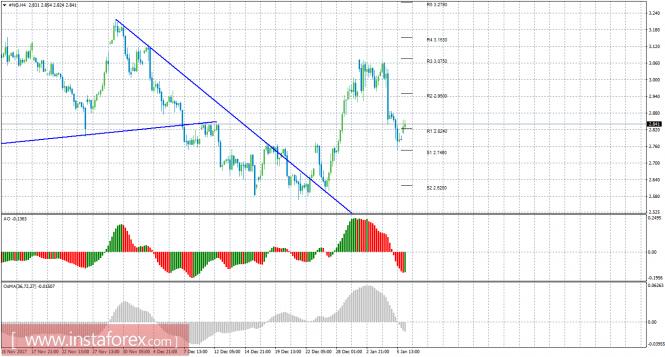 Технический анализ природного газа за 8 января 2018 годаИнстаФорекс - Instaforex, 7 лет назад 4-часовой таймфрейм Анализ: Цена на природный газ в пятницу, 5 января, продолжала корректироваться. Оба индикатора направлены вниз, однако понижаться они начали гораздо раньше, чем произошел разворот цены. Восходящей линии тренда по-прежнему нет, однако в ближайшее время она может быть построена. В начале новой недели цена уже успела закрепиться выше уровня сопротивления R1, что дает неплохие шансы на движение вверх в течение сегодняшнего дня. Разворот одного или обоих индикаторов наверх также может просигнализировать о завершении нисходящей коррекции. Торговые рекомендации: По инструменту #NG сейчас рекомендуется рассматривать лонги с целями 2,9500 и 3,0750. Стоп-лосс выставляется ниже ближайшего уровня поддержки. Рекомендуется выставить Stop Loss в зону безубытка при прибыльности сделки 800-1000 пунктов. Закрепление цены ниже 2,8240 может указать на новый виток коррекции. На сегодня нет запланированных новостей, касающихся газа. Ордера на продажу пока что не актуальны. Помимо технической картины следует также учитывать фундаментальные данные и время их выхода. Пояснения к иллюстрациям: Awesome Oscillator – красные и зеленые бары в окне индикаторов. OsMA – серые бары в окне индикаторов. Линии тренда – синие линии. Уровни поддержки и сопротивления – красные горизонтальные линии.Материал предоставлен компанией InstaForex - www.instaforex.com |