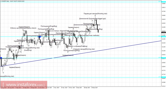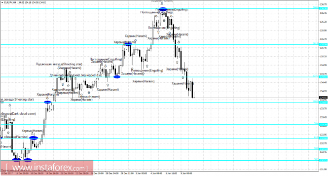 Свечной анализ EUR/JPY на 10 январяИнстаФорекс - Instaforex, 7 лет назад 4h Падение котировок EUR/JPY продолжается на 4-часовом графике в направлении коррекционного уровня 100,0% - 133,87. Отбой курса пары от уровня коррекции 100,0% позволит трейдерам рассчитывать на разворот в пользу европейской валюты и некоторый рост в направлении уровня Фибо 127,2% - 134,61. Образование бычьей формации повысит шансы пары на отбой от уровня коррекции 100,0%. Закрепление котировок под уровнем Фибо 100,0% повысит вероятность дальнейшего падения в направлении следующего коррекционного уровня 76,4% - 133,24. Сетка Фибо построена по экстремумам от 15 ноября 2017 года и 20 ноября 2017 года. Daily На 24-часовом графике медвежья формация «Падающая звезда» позволила выполнить разворот в пользу японской иены и начать падение котировок в направлении уровня Фибо 200,0% - 133,32. Образование бычьей свечной формации позволит рассчитывать на разворот в пользу евровалюты и возобновление роста в направлении коррекционного уровня 261,8% - 139,02. Отбой котировок от уровня коррекции 200,0% аналогично сработает в пользу валюты ЕС. Закрепление курса пары под уровнем Фибо 200,0% повысит шансы на продолжение падения в направлении следующего уровня коррекции 161,8% - 129,81. Сетка Фибо построена по экстремумам от 15 декабря 2016 года и 17 апреля 2017 года. Материал предоставлен компанией InstaForex - www.instaforex.com |