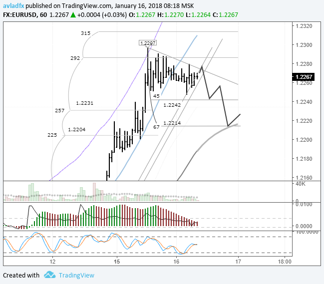 EURUSD: возросли риски пробоя трендовой линииВладислав Антонов - Альпари, 7 лет назад Итоги минувшего торгового дня: В понедельник, 15 января, торги по евро завершились ростом. Евро подорожал до 1,2297 на общем фоне общего ослабления доллара США и заявлений члена управляющего совета ЕЦБ А.Хансона. А.Хансон заявил, что программа покупки облигаций может быть завершена в один этап без каких-либо проблем, а укрепление евро не является угрозой для инфляции. Это не все. Он считает, что регулятору нужно сначала повысить ставки несколько раз, а потом сворачивать программу покупки облигаций. Запланированная статистика (GMT +3): В 10:00 Германия выпустит индекс потребительских цен за декабрь. В 12:30 Британия представит индекс потребительских цен, индекс розничных цен, индекс закупочных цен производителей, и индекс отпускных цен производителей за декабрь. В 16:30 США выпустят индекс активности в производственном секторе от ФРБ Нью-Йорка за январь.