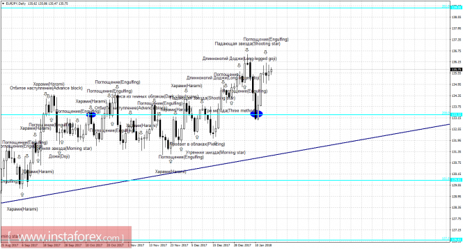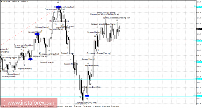 Свечной анализ EUR/JPY на 18 январяИнстаФорекс - Instaforex, 7 лет назад 4h Два отбоя котировок пары EUR/JPY от уровня Фибо 23,6% позволили паре выполнять некоторый рост. Новая медвежья свечная формация «Падающая звезда» вновь позволяет трейдерам ожидать разворот в пользу японской иены и возврат котировок к уровню коррекции 23,6% - 135,29. Закрепление курса пары под уровнем Фибо 23,6% повысит шансы на дальнейшее падение в направлении следующего коррекционного уровня 38,2% - 134,50. Сетка Фибо построена по экстремумам от 20 ноября 2017 года и 5 января 2018 года. Daily На 24-часовом графике отбой котировок от уровня Фибо 200,0% - 133,32 сработал в пользу евровалюты и возобновления роста в направлении коррекционного уровня 261,8% - 139,05. Медвежья свечная формация «Поглощение» позволяет трейдерам рассчитывать на разворот в пользу валюты Японии и некоторое падение котировок в направлении уровня коррекции 200,0%. Закрепление курса под уровнем Фибо 200,0% повысит шансы пары на дальнейшее падение в направлении следующего уровня коррекции 161,8% - 129,81. Сетка Фибо построена по экстремумам от 15 декабря 2016 года и 17 апреля 2017 года. Материал предоставлен компанией InstaForex - www.instaforex.com |