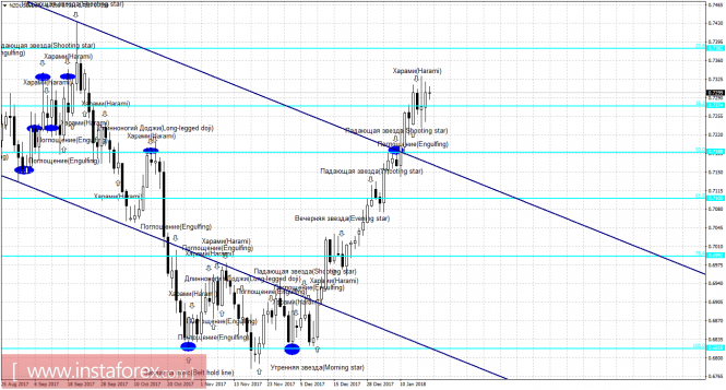 Свечной анализ NZD/USD на 19 январяИнстаФорекс - Instaforex, 7 лет назад 4h Пара NZD/USD на 4-часовом графике выполнила новый разворот в пользу доллара США, после образования медвежьей формации «Длинноногий Доджи», и возврат к уровню коррекции 76,4% - 0,7280. Образование бычьей формации будет трактоваться как трендовый сигнал и позволит рассчитывать на разворот в пользу новозеландской валюты и возобновление роста пары в направлении уровня Фибо 100,0% - 0,7435. Закрепление котировок под уровнем Фибо 76,4% повысит шансы пары на дальнейшее падение в направлении следующего уровня коррекции 61,8% - 0,7184. Сетка Фибо построена по экстремумам от 31 августа 2017 года и 20 сентября 2017 года. Daily На 24-часовом графике котировки выполнили разворот в пользу новозеландской валюты и закрепление над коррекционным уровнем 38,2% - 0,7274. В итоге рост пары может быть продолжен в направлении следующего уровня коррекции 23,6% - 0,7382. Образование медвежьей свечной формации позволит рассчитывать на разворот в пользу американского доллара и некоторое падение котировок. Закрепление пары под уровнем Фибо 38,2% аналогично сработает в пользу некоторого падения в направлении коррекционного уровня 50,0% - 0,7188. Сетка Фибо построена по экстремумам от 11 мая 2017 года и 27 июля 2017 года. Материал предоставлен компанией InstaForex - www.instaforex.com |