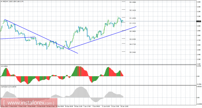 Технический анализ природного газа за 19 января 2018 годаИнстаФорекс - Instaforex, 7 лет назад 4-часовой таймфрейм Анализ: Цена на природный газ начала новый виток нисходящей коррекции и снизилась к уровню поддержки S1. Восходящая линия тренда продолжает поддерживать торгующих на повышение и делать актуальными длинные позиции. Отчет Министерства Энергетики США зафиксировал снижение запасов природного газа, однако какой-либо поддержки эта новость инструменту не оказала. В целом восходящий тренд сохраняется. Первые цели для движения вверх 3,2550 и 3,4230, если цена останется выше уровня 3,1510. В противном случае продолжиться коррекция с целью линия тренда. Торговые рекомендации: По инструменту #NG сейчас рекомендуется рассматривать лонги с целями 3,2550 и 3,4230. Стоп-лосс выставляется ниже ближайшего уровня поддержки. Рекомендуется выставить Stop Loss в зону безубытка при прибыльности сделки 800-1000 пунктов. Отскок цены от линии тренда или разворот наверх одного или обоих индикаторов может указать на окончание витка коррекции. На сегодня нет запланированных новостей, касающихся газа. Ордера на продажу сейчас не актуальны. Помимо технической картины следует также учитывать фундаментальные данные и время их выхода. Пояснения к иллюстрациям: Awesome Oscillator – красные и зеленые бары в окне индикаторов. OsMA – серые бары в окне индикаторов. Линии тренда – синие линии. Уровни поддержки и сопротивления – красные горизонтальные линии.Материал предоставлен компанией InstaForex - www.instaforex.com |