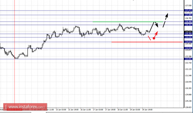 По паре Австралийский доллар/Доллар ключевыми уровнями в масштабе Н1 являются: 0.8104, 0.8063, 0.8039, 0.8013, 0.7977, 0.7957 и 0.7927. Здесь мы продолжаем следить за восходящей структурой от 9 января. Продолжения движения кверху ожидаем после пробоя 0.8013, в данном случае цель – 0.8039, в коридоре 0.8039 – 0.8062 консолидация цены. Потенциальным значением для верха считаем уровень 0.8104, по достижении которого ожидаем консолидацию, а также откат книзу. Краткосрочное нисходящее движение возможно в коридоре 0.7977 – 0.7957, пробой последнего значения приведет к углубленной коррекции, здесь цель – 0.7927, этот уровень является ключевой поддержкой для верха. Основная тенденция – восходящая структура от 9 января. Торговые рекомендации: Buy: 0.8015 Take profit: 0.8039 Buy: 0.8042 Take profit: 0.8062 Sell: 0.7977 Take profit: 0.7958 Sell: 0.7955 Take profit: 0.7930 По паре Евро/Иена ключевыми уровнями в масштабе Н1 являются: 137.47, 137.06, 136.46, 136.16, 135.35, 135.03, 134.62 и 134.04. Здесь мы продолжаем следить за восходящей структурой от 10 января. Продолжения движения кверху ожидаем после прохода ценой шумового диапазона 136.161 136.46, в данном случае цель – 137.06. Потенциальным значением для верха считаем уровень 137.47, по достижении которого ожидаем консолидацию, а также откат книзу. Краткосрочное нисходящее движение возможно в коридоре 135.35 – 135.03, пробой последнего значения приведет к углубленной коррекции, здесь цель – 134.62, этот уровень является ключевой поддержкой для верха, его проход ценой будет располагать к формированию нисходящей структуры, в данном случае цель – 134.04. Основная тенденция – восходящая структура от 10 января. Торговые рекомендации: Buy: 136.48 Take profit: 137.05 Buy: 137.08 Take profit: 137.45 Sell: 135.03 Take profit: 134.64 Sell: 134.60 Take profit: 134.06
