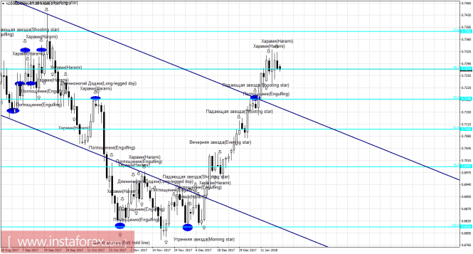 Свечной анализ NZD/USD на 22 январяИнстаФорекс - Instaforex, 7 лет назад 4h Пара NZD/USD на 4-часовом графике выполнила новый разворот в пользу американской валюты, после образования медвежьей формации «Поглощение», и закрепление под уровнем коррекции 76,4% - 0,7280. В итоге падения котировок 22 января может быть продолжено в направлении следующего уровня Фибо 61,8% - 0,7184. Образование бычьей формации будет трактоваться как трендовый сигнал и позволит трейдерам рассчитывать на разворот в пользу новозеландской валюты и возобновление роста пары в направлении коррекционного уровня 100,0% - 0,7435. Сетка Фибо построена по экстремумам от 31 августа 2017 года и 20 сентября 2017 года. Daily На 24-часовом графике котировки выполнили закрепление над коррекционным уровнем 38,2% - 0,7274. Медвежья формация «Харами» позволяет трейдерам ожидать на разворот в пользу американского доллара и некоторое падение котировок. Закрепление курса пары под уровнем Фибо 38,2% аналогично сработает в пользу начала падения в направлении коррекционного уровня 50,0% - 0,7188. Образование бычьей формации позволит рассчитывать на продолжение процесса роста в направлении уровня Фибо 23,6% - 0,7382. Сетка Фибо построена по экстремумам от 11 мая 2017 года и 27 июля 2017 года. Материал предоставлен компанией InstaForex - www.instaforex.com |