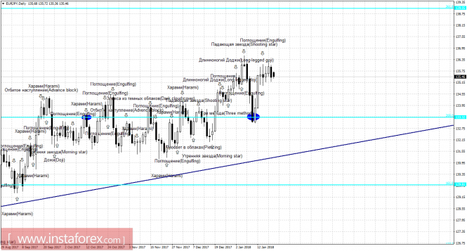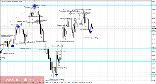 Свечной анализ EUR/JPY на 22 январяИнстаФорекс - Instaforex, 7 лет назад 4h Отбой котировок пары EUR/JPY от уровня коррекции 23,6% - 135,29 и образование бычьей свечной формации «Поглощение» позволили выполнить разворот в пользу валюты ЕС и начать процесс роста в направлении коррекционного уровня 0,0% - 136,56. Образование 22 января медвежьей свечной формации сработает в пользу японской иены и возобновления процесса падения котировок. Закрепление пары под уровнем Фибо 23,6% повысит вероятность дальнейшего падения в направлении следующего уровня коррекции 38,2% - 134,50. Сетка Фибо построена по экстремумам от 20 ноября 2017 года и 5 января 2018 года. Daily На 24-часовом графике медвежья свечная формация «Поглощение» не позволила паре начать процесс падения. В итоге рост котировок может быть продолжен в направлении уровня Фибо 261,8% - 139,05. Образование новой медвежьей формации вновь позволит трейдерам рассчитывать на разворот пары в пользу валюты Японии и возврат к уровню коррекции 200,0% - 133,32. Закрепление курса пары под уровнем Фибо 200,0% повысит шансы пары на продолжение падения в направлении следующего коррекционного уровня 161,8% - 129,81. Сетка Фибо построена по экстремумам от 15 декабря 2016 года и 17 апреля 2017 года. Материал предоставлен компанией InstaForex - www.instaforex.com |