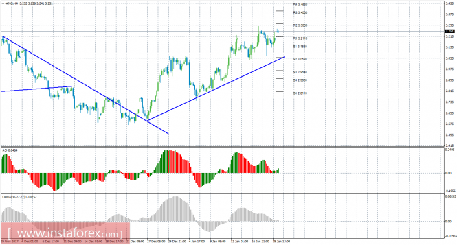 Технический анализ природного газа за 22 января 2018 годаИнстаФорекс - Instaforex, 7 лет назад 4-часовой таймфрейм Анализ: Цена на природный газ в целом продолжает движение вверх и в начале новой недели уже преодолела уровень сопротивления R1. Восходящая линия тренда продолжает свидетельствовать о восходящей тенденции по инструменту и делать актуальными лонги. Оба индикатора развернулись наверх, также сигнализируя о текущем восходящем движении. Отскок цены от уровня сопротивления R2 может спровоцировать виток нисходящей коррекции к линии тренда. Торговые рекомендации: По инструменту #NG сейчас рекомендуется рассматривать лонги с целями 3,3060 и 3,4000. Стоп-лосс выставляется ниже ближайшего уровня поддержки. Рекомендуется выставить Stop Loss в зону безубытка при прибыльности сделки 800-1000 пунктов. Отскок цены от уровня 3,3060 или разворот вниз одного или обоих индикаторов может указать на новый виток коррекции. На сегодня нет запланированных новостей, касающихся газа. Ордера на продажу сейчас не актуальны. Помимо технической картины следует также учитывать фундаментальные данные и время их выхода. Пояснения к иллюстрациям: Awesome Oscillator – красные и зеленые бары в окне индикаторов. OsMA – серые бары в окне индикаторов. Линии тренда – синие линии. Уровни поддержки и сопротивления – красные горизонтальные линии.Материал предоставлен компанией InstaForex - www.instaforex.com |