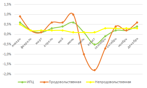 График 1. Динамика помесячной инфляции потребительских цен в РФ, январь-декабрь 2017, %