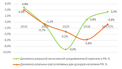 П = прогноз Источник: Росстат Розничные продажи к концу года восстановились Если за 9 месяцев 2017 года розничные продажи выросли на 0,6% в годовом исчислении, то по итогам 11 месяцев 2017 года этот показатель подрос уже на 1%. При этом в третьем квартале рост розничных продаж в годовом исчислении составил 2,1%. Полагаем, что рост реальной заработной платы при отсутствии существенного роста цен на большинство видов потребительских товаров (в первую очередь продовольствия), а также снижение процентных ставок, которое стимулировало спрос, в том числе, на потребительские кредиты, в определенной степени способствовали росту розничных продаж. Инвестиций пока недостаточно Инвестиции в основной капитал российских предприятий за 9 месяцев 2017 года выросли на 4,2% к аналогичному периоду 2016 года, хотя во втором полугодии рост инвестиций замедлился. Наибольший приток инвестиций (16% от общего объема инвестиций в производство) наблюдается в отрасль добычи нефти и газа, это почти столько же, сколько во всю обрабатывающую промышленность (16,5%). Остальные отрасли испытывают сильный недостаток инвестиций, что и является причиной более медленного роста промышленности и ВВП, чем могло бы быть. Нефть: максимум за максимумом Нефть смеси Brent в четвертом квартале выросла на 4,8%, а по итогам 2017 года подорожала в итоге на 17%. Со второй декады декабря нефть марки Brent непрерывно росла в цене, обновляя годовые максимумы, цена барреля Brent вплотную подобралась к концу года к уровню в $70. Продление в ноябре 2017 года сделки ОПЕК+ до конца 2018 года, вместе с достаточно оптимистичными прогнозами ОПЕК относительно роста мирового спроса на нефть воодушевили рынок нефти. В первом квартале 2018 года рост цены нефти, на наш взгляд, может продолжиться, хотя и более медленными темпами. Валютный рынок: рубль укрепился на фоне растущей нефти По итогам четвертого квартала ушедшего года рубль подорожал к доллару на 0,6%, а к евро, наоборот, подешевел на 1,8%. А за весь 2017 год рубль вырос к доллару на 3,5%, а к евро – упал на 9%. Рост курса рубля к доллару мог быть вызван различными факторами. Во-первых, тем, что доллар за 2017 год подешевел к евро на 14%, во-вторых, мощным ростом цены на нефть во втором полугодии 2017 года, в-третьих, на укрепление рубля повлияли низкая инфляция и возобновление роста российской экономики. Важно отметить, что для экономики России, которая по-прежнему зависит от экспорта углеводородов, не было выгодно слишком поспешное укрепление рубля, так что динамику рубля к доллару и евро в 2017 году можно считать вполне адекватной экономической ситуации в стране. Мы считаем, что на динамику курса рубля в первом квартале 2018 года могут повлиять следующие события: «Список Трампа»: возможно ли новое ужесточение антироссийских санкций? В конце января Министерство финансов США представит Конгрессу список российских бизнесменов, которые, по мнению сторонников ужесточения антироссийских санкций, тесно взаимодействуют с властью или наиболее близки президенту России. Хотя сам по себе список не обязательно должен означать, что против всех лиц, включенных в этот список, санкции обязательно будут введены, однако публикация такого списка может привести к тому, что этим лицам будет невозможно вести бизнес в США либо привлекать американские инвестиции в свой бизнес. На российском фондовом рынке еще в 
