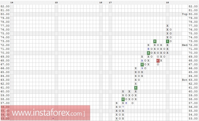 Индекс относительной силы развернулся в колонку "О" и находится на отметке 55%, что обусловлено возобновление нисходящего движения, в рамках коррекции, от уровня сопротивления 77.