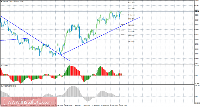Технический анализ природного газа за 23 января 2018 годаИнстаФорекс - Instaforex, 7 лет назад 4-часовой таймфрейм Анализ: Цена на природный газ в целом продолжает несильное движение вверх и в начале новой недели преодолела уровень сопротивления R1. Восходящая линия тренда продолжает свидетельствовать о восходящей тенденции по инструменту и делать актуальными ордера на покупку. Отскок цены от уровня сопротивления R2 может спровоцировать виток нисходящей коррекции к линии тренда. По инструменту наблюдаются частые и маленькие витки нисходящей коррекции. Торговые рекомендации: По инструменту #NG сейчас рекомендуется рассматривать лонги с целями 3,3060 и 3,4000. Стоп-лосс выставляется ниже ближайшего уровня поддержки. Рекомендуется выставить Stop Loss в зону безубытка при прибыльности сделки 800-1000 пунктов. Отскок цены от уровня 3,3060 или разворот вниз OsMA укажет на новый виток коррекции. На сегодня нет запланированных новостей, касающихся газа. Ордера на продажу сейчас не актуальны. Помимо технической картины следует также учитывать фундаментальные данные и время их выхода. Пояснения к иллюстрациям: Awesome Oscillator – красные и зеленые бары в окне индикаторов. OsMA – серые бары в окне индикаторов. Линии тренда – синие линии. Уровни поддержки и сопротивления – красные горизонтальные линии.Материал предоставлен компанией InstaForex - www.instaforex.com |