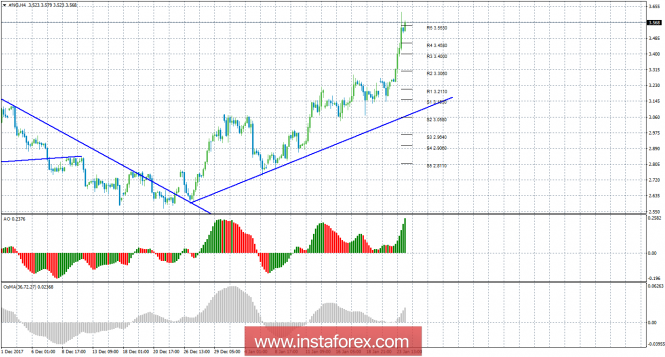 Технический анализ природного газа за 24 января 2018 годаИнстаФорекс - Instaforex, 7 лет назад 4-часовой таймфрейм Анализ: Цена на природный газ продолжает усилившееся движение вверх и в середине новой недели уже отработала последний уровень сопротивления R5. Восходящая линия тренда продолжает свидетельствовать о восходящей тенденции по инструменту и делать актуальными ордера на покупку. Отскок цены от уровня сопротивления R5 может спровоцировать виток нисходящей коррекции к линии тренда. Преодоление уровня 3,5530 сделает возможным продолжение движения вверх, однако целей для этой недели больше нет. Торговые рекомендации: По инструменту #NG сейчас рекомендуется рассматривать лонги с целью 3,5530. Стоп-лосс выставляется ниже ближайшего уровня поддержки. Рекомендуется выставить Stop Loss в зону безубытка при прибыльности сделки 800-1000 пунктов. Отскок цены от уровня 3,5530 или разворот вниз OsMA или Awesome укажет на начало коррекции. На сегодня нет запланированных новостей, касающихся газа. Ордера на продажу сейчас не актуальны. Помимо технической картины следует также учитывать фундаментальные данные и время их выхода. Пояснения к иллюстрациям: Awesome Oscillator – красные и зеленые бары в окне индикаторов. OsMA – серые бары в окне индикаторов. Линии тренда – синие линии. Уровни поддержки и сопротивления – красные горизонтальные линии.Материал предоставлен компанией InstaForex - www.instaforex.com |
