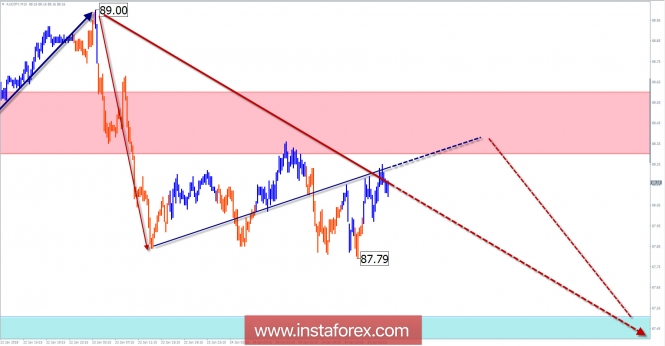 Торговый обзор на 25 января по упрощенному волновому анализуИнстаФорекс - Instaforex, 7 лет назад Обзор и прогноз по GBP/USD Доминирующее направление ценового тренда мажора британского фунта с октября 2016 года продолжает задаваться восходящей волной. К текущему дню цена преодолела верхний рубеж встречной потенциально-разворотной зоны, открыв дорогу для дальнейшего подъема. Следующая критическая зона графика располагается выше текущих значений курса, примерно, на 5 ценовых фигур. Сегодня не исключена кратковременная остановка подъема, с отработкой коррекционной фазы движения. Наиболее вероятным сценарием станет боковой дрейф, не ниже уровней зоны поддержки. Далее можно рассчитывать на возобновление восходящего настроя пары. Зона сопротивления демонстрирует ожидаемую верхнюю границу суточного хода. Границы зон сопротивления: - 1.4370/1.4400 Границы зон поддержки: - 1.4250/20 Обзор и прогноз по AUD/JPY В результате развития полуторагодичной восходящей волны, цена кросса достигла предварительной целевой зоны. С июля прошлого года котировки пары курсируют вдоль нижнего рубежа зоны в боковом ценовом коридоре. Приближение масштаба указывает дату 24 ноября прошлого года в качестве отправной точки последней, незавершенной бычьей волны. Неделю назад цена начал формировать нисходящую волну, потенциал которой указывает на возможное начало коррекционной части (В). Сегодня наиболее вероятен флетовый настрой движения пары. В первой половине дня ожидается завершение начавшегося вчера подъема цены. В рамках расчетной зоны сопротивления далее можно рассчитывать на смену направления движения и ход цены вниз. Границы зон сопротивления: - 88.30/60 Границы зон поддержки: - 87.50/20 Пояснения к рисункам: Для упрощенного волнового анализа используется простейший вид волны в виде зигзага, сочетающий в себе 3 части (А;В;С). Из таких волн состоят все виды коррекции и большая часть импульсов. На каждом тайм-фрейме анализируется последняя, незавершенная волна. Отмеченные на графиках зоны указывают расчетные участки, где вероятность смены направления движения значительно повышается. Стрелки указывают волновую разметку по используемой автором методике. Сплошным фоном стрелок указана сформированная структура, пунктирным – ожидаемые волновые движения. Внимание: Волновой алгоритм не учитывает продолжительность движений инструмента по времени. Прогноз не является торговым сигналом! Для проведения торговой сделки требуются подтверждающие сигналы используемых Вами торговых систем Материал предоставлен компанией InstaForex - www.instaforex.com |