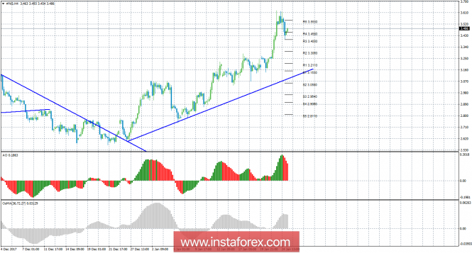Технический анализ природного газа за 25 января 2018 годаИнстаФорекс - Instaforex, 7 лет назад 4-часовой таймфрейм Анализ: Цена на природный газ отработала последний уровень сопротивления R5 и не смогла его преодолеть, начав нисходящую коррекцию, о чем также просигнализировали оба индикатора, Awesome и OsMA. Восходящая линия тренда продолжает свидетельствовать о восходящей тенденции по инструменту и делать актуальными ордера на покупку. Если цена останется выше уровня R4, то движение вверх сможет возобновиться. Разворот вверх одного или обоих индикаторов также может указать на окончание коррекции, хотя с реакцией на это индикаторы могут опоздать. Торговые рекомендации: По инструменту #NG сейчас рекомендуется рассматривать лонги с целью 3,5530. Стоп-лосс выставляется ниже ближайшего уровня поддержки. Рекомендуется выставить Stop Loss в зону безубытка при прибыльности сделки 800-1000 пунктов. Отскок цены от уровня 3,4000 или разворот вверх OsMA или Awesome укажет на завершение коррекции. На сегодня запланирован отчет Министерства Энергетики США по изменению запасов газа (15-30 GMT). Ордера на продажу сейчас не актуальны. Помимо технической картины следует также учитывать фундаментальные данные и время их выхода. Пояснения к иллюстрациям: Awesome Oscillator – красные и зеленые бары в окне индикаторов. OsMA – серые бары в окне индикаторов. Линии тренда – синие линии. Уровни поддержки и сопротивления – красные горизонтальные линии.Материал предоставлен компанией InstaForex - www.instaforex.com |