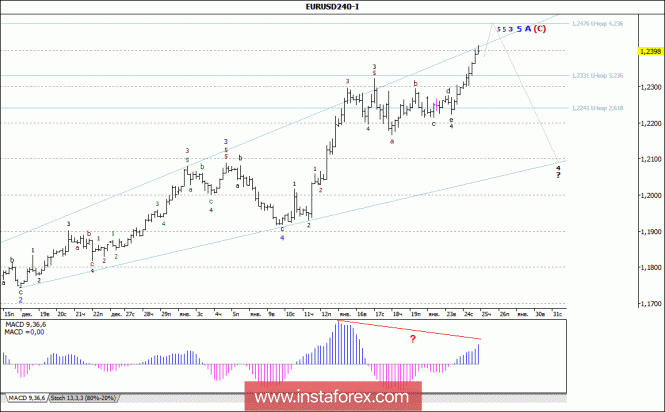 Волновой анализ валютной пары EUR/USD за 25 января 2018 годаИнстаФорекс - Instaforex, 7 лет назад Анализ волновой разметки: В преддверии сегодняшнего заседания ЕЦБ вчерашние торги пара EUR/USD начала с восходящего движения и, прибавив в цене около 120 п.п., в конце дня пробила уровень 24-й фигуры. При этом можно предположить, что валютная пара продолжала развитие внутренней волновой структуры 5-й волны, в 3-й, в 5-й, в А, в (С), в составе всего восходящего тренда, берущего начало еще от минимума начала января минувшего года. Если это так, то похоже на то, что отработка расчетной цели в районе отметки 1,2475, позволит валютной обозначить вершину всей этой 3-й волны, в 5-й, в А, в (С). Цели для построения нисходящей волны: 1,2000 – 1,2100 Цели для построения восходящей волны: 1,2476 – 423,6% по Фибоначчи 1,2500 Общие выводы и торговые рекомендации: Продолжается построение повышательной волны А, в (С), внутренняя разметка которой понесла изменения. Повышение котировок может продолжиться с целями, находящимися около расчетной отметки 1,2476, что соответствует 423,6% по Фибоначчи, и выше, около 25 фигуры, в рамках волны 3, в 5, в А, в (С). В рамках коррекционной волны 4 может начаться отход котировок от достигнутых максимумов с целями, находящимися около 21 фигуры.Материал предоставлен компанией InstaForex - www.instaforex.com |