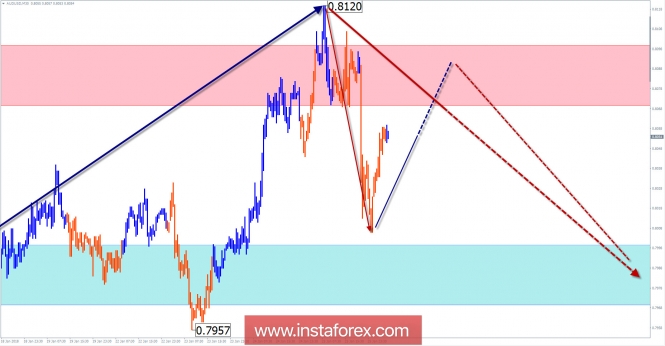 Торговый обзор на 26 января по упрощенному волновому анализуИнстаФорекс - Instaforex, 7 лет назад Обзор и прогноз по AUD/USD На дневном масштабе графика основной пары австралийского доллара с января 2016 года отлеживается начало последней, незавершенной до сих пор, волны. В сентябре прошлого года цена приблизилась к нижней границе широкой зоны потенциального разворота. Структура всей волны не выглядит завершенной. Это позволяет предполагать формирование от этой зоны встречной промежуточной коррекции. В нисходящей волне от 8 сентября к настоящему времени близится к завершению средняя часть (В). Котировки пары вновь достигли критической зоны, где можно ждать смену междневного тренда. Сегодня наиболее вероятен флетовый настрой движения. В первой половине дня ожидается завершение ценового подъема. Далее можно рассчитывать на смену курса и ход цены вниз. Зона поддержки обозначает нижнюю границу суточной волатильности пары. Границы зон сопротивления: - 0.8070/0.8100 Границы зон поддержки: - 0.8000/0.7970 Обзор и прогноз по GBP/JPY Конец формирующейся с октября 2016 года геометрической фигуры «восходящий вымпел» графика кросса упирается в верхнюю границу потенциальной зоны разворота. В пользу скорой смены направления движения говорит завершенность структуры текущей волновой модели, дополненной наличием на ее конце потенциально разворотной конструкции. Медвежья волна стартовала 21 сентября. На момент анализа близится к завершению средняя часть зигзага (В). Судя по виду структуры всей формирующейся фигуры, предстоящая часть волны (С) может иметь ограниченный диапазон хода вниз. Сегодня высока вероятность начала корректирующего снижения. Разворот более вероятен во второй половине дня, в рамках расчетной зоны сопротивления. Нижним рубежом суточного хода пары выступает зона поддержки. Границы зон сопротивления: - 155.30/60 Границы зон поддержки: - 154.40/153.90 Пояснения к рисункам: Для упрощенного волнового анализа используется простейший вид волны в виде зигзага, сочетающий в себе 3 части (А;В;С). Из таких волн состоят все виды коррекции и большая часть импульсов. На каждом тайм-фрейме анализируется последняя, незавершенная волна. Отмеченные на графиках зоны указывают расчетные участки, где вероятность смены направления движения значительно повышается. Стрелки указывают волновую разметку по используемой автором методике. Сплошным фоном стрелок указана сформированная структура, пунктирным – ожидаемые волновые движения. Внимание: Волновой алгоритм не учитывает продолжительность движений инструмента по времени. Прогноз не является торговым сигналом! Для проведения торговой сделки требуются подтверждающие сигналы используемых Вами торговых систем. Материал предоставлен компанией InstaForex - www.instaforex.com |