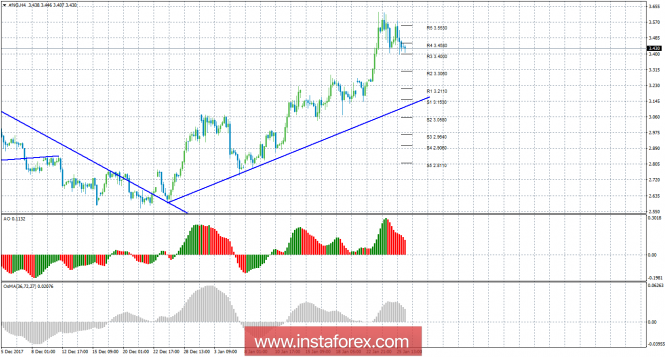 Технический анализ природного газа за 26 января 2018 годаИнстаФорекс - Instaforex, 7 лет назад 4-часовой таймфрейм Анализ: Цена на природный газ отработала последний уровень сопротивления R5 еще раз и вновь не смогла его преодолеть, начав нисходящую коррекцию, о чем также просигнализировали оба индикатора, Awesome и OsMA. Восходящая линия тренда продолжает свидетельствовать о восходящей тенденции по инструменту и делать актуальными ордера на покупку. Коррекция может продолжиться сегодня с целями уровни 3,4000 и 3,3060. Разворот вверх одного или обоих индикаторов также может указать на окончание коррекции, хотя с реакцией на это индикаторы могут немного опоздать. Торговые рекомендации: По инструменту #NG сейчас рекомендуется рассматривать лонги с целью 3,5530. Стоп-лосс выставляется ниже ближайшего уровня поддержки. Рекомендуется выставить Stop Loss в зону безубытка при прибыльности сделки 800-1000 пунктов. Отскок цены от уровня 3,4000 или разворот вверх OsMA или Awesome укажет на завершение коррекции. На сегодня нет запланированных новостей, касающихся газа. Ордера на продажу сейчас не актуальны. Помимо технической картины следует также учитывать фундаментальные данные и время их выхода. Пояснения к иллюстрациям: Awesome Oscillator – красные и зеленые бары в окне индикаторов. OsMA – серые бары в окне индикаторов. Линии тренда – синие линии. Уровни поддержки и сопротивления – красные горизонтальные линии.Материал предоставлен компанией InstaForex - www.instaforex.com |