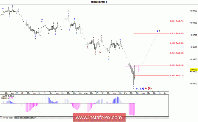 Волновой анализ валютной пары USD/CHF за 26 января 2018 годаИнстаФорекс - Instaforex, 7 лет назад Анализ волновой разметки: Начав вчерашние торги с нисходящего движения, пара USD/CHF потеряла более 160 п.п. и во второй половине дня пробила уровень 93-й фигуры. Таким образом, в связи с преодолением валютной парой сентябрьского минимума минувшего года (0,9320) появились основания, позволяющие рассматривать всё 13-месячное снижение цены от максимума 15 декабря 2016 года как процесс формирования волны (2), в А, (В), в составе восходящего участка главного тренда, берущего начало еще в августе 2011 года. Если это так, то вчерашним ростом котировок от отметки 0,9290 валютная пара предприняла попытку завершить 3-ю волну, в С, в (2), в А, (В) и обозначить начало 4-й волны, в С, в (2), в А, (В), расчетные цели которой могут простираться вплоть до уровня 0,9800. Цели для варианта с восходящей волной: 0,9551 – 38,2% по Фибоначчи 0,9632 – 50,0% по Фибоначчи Цели для варианта с нисходящей волной: 0,9400 – 0,9300 Общие выводы и торговые рекомендации: Валютная пара продолжает построение понижательного набора волн. Вся волновая разметка понесла определенные изменения. Предполагаемая волна 3, в С, в (2), в А, (В) завершила свое построение. Таким образом, повышение котировок может продолжиться с в рамках коррекционной волны 4 с целями, находящимися около расчетных отметок 0,9551 и 0,9632, что соответствует 38,2% и 50,0% по Фибоначчи.Материал предоставлен компанией InstaForex - www.instaforex.com |