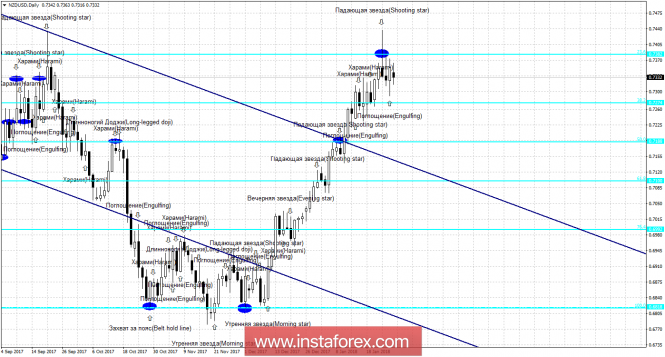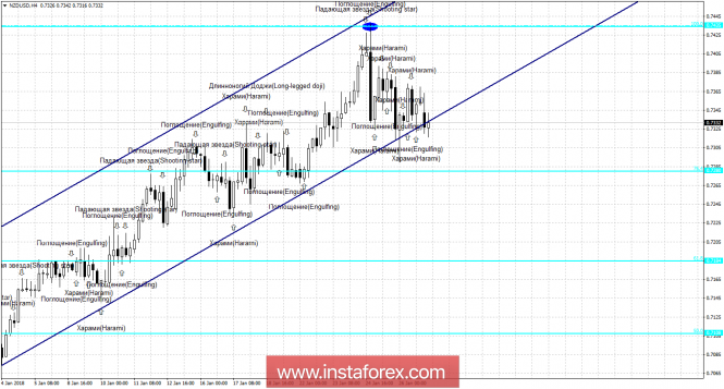 Свечной анализ NZD/USD на 29 январяИнстаФорекс - Instaforex, 7 лет назад 4h Пара NZD/USD на 4-часовом графике возобновила процесс падения в направлении коррекционного уровня 76,4% - 0,7280, после образование медвежьей формации «Харами». Еще было образовано несколько свечных формаций. Образование 29 января бычьей формации позволит ожидать разворот пары в пользу валюты Новой Зеландии и некоторый рост в направлении уровня коррекции 100,0% - 0,7435. Отбой пары от уровня Фибо 74,6% аналогично сработает в пользу начала роста котировок. Закрепление пары под уровнем коррекции 76,4% повысит вероятность дальнейшего падения в направлении следующего уровня Фибо 61,8% - 0,7184. Сетка Фибо построена по экстремумам от 31 августа 2017 года и 20 сентября 2017 года. Daily На 24-часовом графике отбой от коррекционного уровня 23,6% - 0,7382 сработал в пользу доллара США, бычья свечная формация «Поглощение» позволяет рассчитывать на разворот в пользу новозеландской валюты и возврат котировок к уровню Фибо 23,6%. Образование новой медвежьей формации вновь сработает в пользу американского доллара и возобновления падения в направлении уровня коррекции 38,2% - 0,7274. Закрепление пары над уровнем Фибо 23,6% повысит вероятность продолжения роста в направлении следующего уровня коррекции 0,0% - 0,7556. Сетка Фибо построена по экстремумам от 11 мая 2017 года и 27 июля 2017 года. Материал предоставлен компанией InstaForex - www.instaforex.com |