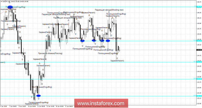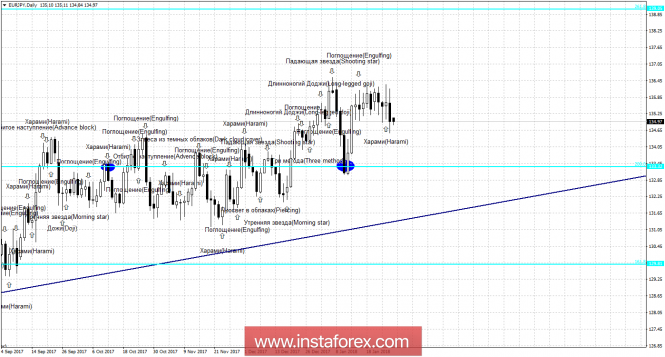 Свечной анализ EUR/JPY на 29 январяИнстаФорекс - Instaforex, 7 лет назад 4h Медвежья свечная формация «Поглощение» и предшествующая ей «Харами», образовавшиеся по паре EUR/JPY на 4-часовом графике, позволили выполнить разворот в пользу японской валюты и закрепление под уровнем Фибо 23,6% - 135,29. Бычья формация «Харами» остановила процесс падения, выполнен разворот в пользу евровалюты и может быть выполнен возврат к уровню коррекции 23,6% - 135,29. Образование 29 января новой медвежьей формации вновь позволит ожидать разворот в пользу японской иены и возобновление падения в направлении уровня Фибо 38,2% - 134,50. Сетка Фибо построена по экстремумам от 20 ноября 2017 года и 5 января 2018 года. Daily На 24-часовом графике пара выполнила разворот в пользу валюты Японии без образования медвежьей свечной формации и начала падение в направлении коррекционного уровня 200,0% - 133,32. Образование бычьей формации позволит трейдерам рассчитывать на разворот в пользу валюты ЕС и возобновление процесса роста в направлении уровня коррекции 261,8% - 139,05. Отбой курса пары от уровня Фибо 200,0% аналогично сработает в пользу начала роста пары. Закрепление котировок под уровнем коррекции 200,0% повысит шансы на продолжение падения в направлении следующего уровня Фибо 161,8% - 129,81. Сетка Фибо построена по экстремумам от 15 декабря 2016 года и 17 апреля 2017 года. Материал предоставлен компанией InstaForex - www.instaforex.com |