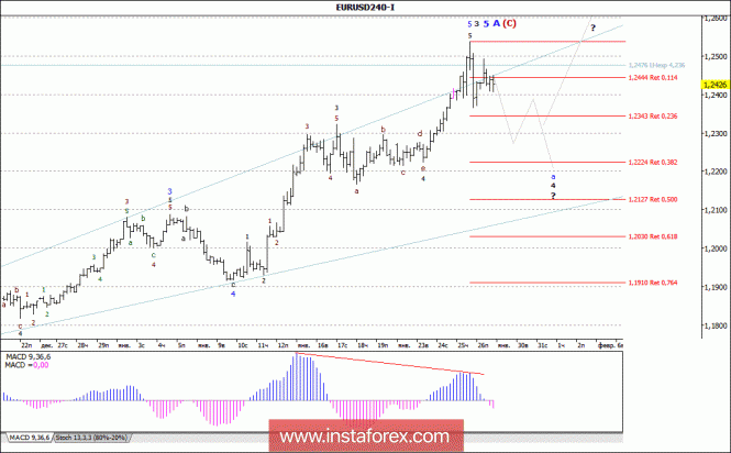 Волновой анализ валютной пары EUR/USD за 29 января 2018 годаИнстаФорекс - Instaforex, 7 лет назад Анализ волновой разметки: Пятничные торги пара EUR/USD начала с отката цены от достигнутого в четверг минимума и уже в начале европейской сессии практически возвратилась к уровню 25-й фигуры. Складывающаяся при этом волновая ситуация позволяет предполагать, что валютная предприняла очередную попытку завершить 3-ю волну, в 5-й, в А, в (С) и перейти в стадию формирования волны а, в составе 4-й волны, в 5-й, в А, в (С). Если это так и вся 3-я волна, в 5-й, в А, в (С) не станет принимать еще более сложную форму, то валютная пара может продолжить снижение котировок в направлении уровня 1,2200. Цели для построения нисходящей волны: 1,2100 – 1,2200 Цели для построения восходящей волны: 1,2500 Общие выводы и торговые рекомендации: Продолжается построение повышательной волны А, в (С), внутренняя разметка которой понесла изменения. Предполагаемая волна 3, в 5, в А, в (С), возможно, завершила свое построение около расчетной отметки 1,2476, что соответствует 423,6% по Фибоначчи. Если это действительно так, то в рамках коррекционной волны 4 может начаться отход котировок от достигнутых максимумов с целями, находящимися около 21 и 22 фигур. Дивергенция MACD_ака также предупреждает о готовности инструмента к построению понижательной волны.Материал предоставлен компанией InstaForex - www.instaforex.com |