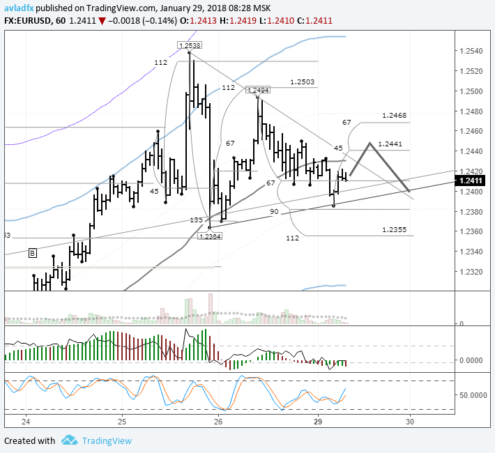 EURUSD: цена консолидируется в ценовом диапазоне четверга за 25 январяВладислав Антонов - Альпари, 8 лет назад Итоги минувшего торгового дня: В пятницу, 26 января, торги по евро завершились ростом. Евро укрепился к доллару на азиатской сессии и растерял все заработанные очки на торгах в Штатах. Доллар подорожал по всему рынку, проигнорировав слабые данные по ВВП в США за 4 квартал. Значение индекса ВВП оказалось ниже прогнозируемого уровня, плюс было пересмотрено предыдущее значение в сторону снижения, что является негативным фактором для американской валюты. Негативные факторы нивелировались индексом заказов на товары длительного пользования, который оказался значительно лучше ожиданий рынка и ростом доходности 10-летних американских облигаций. С достигнутого максимума 1,2494 курс снизился до 1,2406 (-88 п.). Американская статистика: Индекс валового внутреннего продукта в США +2.6% за год. (прогноз 3.0%, предыдущее значение пересмотрено с 3,2% до 2,6%). Индекс заказов на товары длительного пользования в США за декабрь составили 2.9% (прогноз был 0,8%, предыдущее значение пересмотрено с 1,3 до 1,7%. Запланированная статистика (GMT +3): В 10:00 Британия опубликует индекс цен на жилье от Nationwide за январь. В 13:00 с речью выступит член правления ЕЦБ Питер Прат. В 13:45 с речью выступит член исполнительного совета ЕЦБ Сабине Лаутеншлегер. В 16:30 США представят базовый индекс расходов на личное потребление за декабрь, а также заявят об изменении личных расходов и доходов населения за декабрь. В 19:00 с речью выступит член правления ЕЦБ Бенуа Керре.
