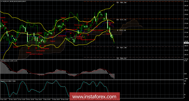 Технический и свечной анализ акций Apple на 29 января 2018 годаИнстаФорекс - Instaforex, 7 лет назад 4-часовой таймфрейм 15-минутный таймфрейм Техническая картина: На торговой сессии 26 января стоимость акций Apple вновь подешевела, но на этот раз уже не так сильно, как на предыдущих торговых сессиях. Каких-либо новых важных данных от компании Apple не поступало в последние дни. Полосы Боллинджера направлены вниз, что свидетельствует о нисходящей тенденции по инструменту, а цена, открывшись с гэпом вниз, уже почти достигла первый уровень поддержки 167,78. Таким образом, стоимость акций за последние 5 дней потеряла больше 10 долларов. Продолжает отрабатываться новый сигнал на продажу «мертвый крест», который является сильным и подтвержденным, так как цена закрепилась ниже облака Ишимоку. Таким образом, сейчас являются актуальными короткие позиции с целью 167,78, а если этот таргет будет преодолен, то с целью 164,22. Разворот индикатора MACD наверх просигнализирует о витке восходящей коррекции. Новых свечных моделей на данный момент нет. На 15-минутном графике видно, что цена закрепилась ниже всех линий индикатора Ишимоку, поэтому движение вниз может продолжиться, если цена преодолеет уровень 167,78, с целью 164,22. Последний верхний фрактал не обновлен, а последний нижний – обновлен, поэтому шансов сейчас больше именно у движения вниз. Торговые рекомендации для 4-часового таймфрейма: Цена акций Apple продолжает движение вниз. На текущем графике сейчас рекомендуется рассматривать ордера на продажу с целями 167,78 и 164,22. Сокращать вручную шорты можно будет при отскоке цены от первого таргета, при формировании бычьей модели (с подтверждением) или в случае разворота индикатора MACD наверх. Стоп-лосс при торговле на понижение выставляем выше критической линии 175,03. Длинные позиции сейчас не актуальны. Торговые рекомендации для 15-минутного таймфрейма: На 15-минутном графике рекомендуется рассматривать ордера на продажу с целью 164,22, при открытии или закреплении ниже 167,78 и ордером Stop Loss выше 167,78 и при направленном вниз MACD. Помимо технической картины следует также учитывать фундаментальные данные и время их выхода. Не рекомендуется переносить открытые сделки на следующую торговую сессию из-за вероятности образования гэпа или же обязательно выставлять ордер Стоп Лосс. Сигналы, полученные от свечных моделей, наиболее сильные, когда совпадают с другими сигналами (отскок, закрепление, MACD) или требуют своего подтверждения. Пояснения к иллюстрации (график 1): Индикатор Ишимоку: Тенкан-сен – красная линия. Киджун-сен – синяя линия. Сенкоу Спан А – светло-коричневая пунктирная линия. Сенкоу Спан Б – светло-фиолетовая пунктирная линия. Чинкоу Спан – зеленая линия. Индикатор MACD – красная линия и гистограмма с белыми барами в окне индикаторов. Красные горизонтальные пунктирные линии – уровни поддержки и сопротивления. Индикатор Stochastic – голубая и красная пунктирные линии в окне индикаторов. Индикатор Боллинджер Бандс – 3 желтые линии. Различные свечные комбинации. Пояснения к иллюстрации (график 2): Торговые сессии – вертикальные пунктирные желтые линии. Красные горизонтальные пунктирные линии – уровни поддержки и сопротивления. Разноцветные горизонтальные линии – линии индикатора Ишимоку старшего таймфрейма. Синие крестики – фракталы. Индикатор MACD – красная линия и гистограм