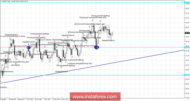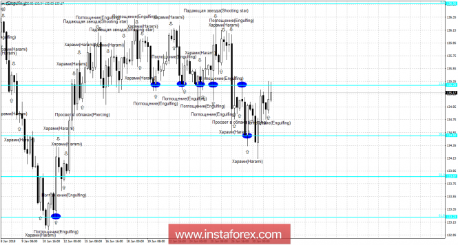 Свечной анализ EUR/JPY на 31 январяИнстаФорекс - Instaforex, 7 лет назад 4h Пара EUR/JPY на 4-часовом графике выполнила разворот в пользу японской иены и рост к уровню коррекции 23,6% - 135,29. Отбой пары 31 января от уровня Фибо 23,6% позволит трейдерам рассчитывать на разворот в пользу японской валюты и некоторое падение в направлении уровня коррекции 38,2% - 134,50. Образование медвежьей свечной формации повысит шансы пары на отбой от уровня Фибо 23,6%. Закрепление котировок над уровнем коррекции 23,6% повысит вероятность дальнейшего роста в направлении следующего уровня Фибо 0,0% - 136,56. Сетка Фибо построена по экстремумам от 20 ноября 2017 года и 5 января 2018 года. Daily На 24-часовом графике пара выполнила разворот в пользу японской иены и продолжает падение в направлении коррекционного уровня 200,0% - 133,32. Образование бычьей свечной формации позволит ожидать разворот в пользу валюты ЕС и возобновление процесса роста в направлении уровня коррекции 261,8% - 139,05. Отбой курса пары от уровня Фибо 200,0% аналогично сработает в пользу начала роста. Закрепление котировок под уровнем коррекции 200,0% повысит шансы на дальнейшее падение в направлении следующего уровня Фибо 161,8% - 129,81. Сетка Фибо построена по экстремумам от 15 декабря 2016 года и 17 апреля 2017 года. Материал предоставлен компанией InstaForex - www.instaforex.com |