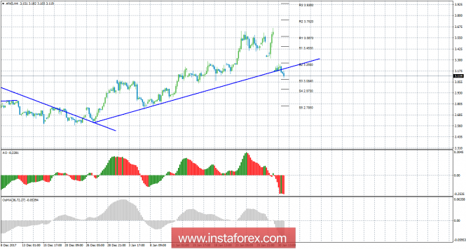Технический анализ природного газа за 31 января 2018 годаИнстаФорекс - Instaforex, 7 лет назад 4-часовой таймфрейм Анализ: Цена на природный газ во вторник, 30 января, снизилась к восходящей линии тренда, а потом и закрепилась ниже нее. Таким образом, восходящая тенденция по инструменту отменяется. Теперь по инструменту стали доступными для рассмотрения короткие позиции. Оба индикатора по-прежнему направлены вниз, сигнализируя о нисходящем движении. Оба в ближайшие часы могут начать разряжаться, так как находятся на своих минимальных значениях. Отскок цены от первого таргета может спровоцировать виток восходящей коррекции. Торговые рекомендации: По инструменту #NG сейчас рекомендуется рассматривать шорты с целями 3,0840 и 2,9700. Стоп лосс выставляется выше ближайшего уровня сопротивления. Рекомендуется выставить Stop Loss в зону безубытка при прибыльности сделки 800-1000 пунктов. Отскок цены от уровня 3,0840 или разворот вверх OsMA или Awesome(могут разряжаться) укажет на виток коррекции. На сегодня нет запланированных новостей, касающихся газа. Ордера на покупку потеряли свою актуальность. Помимо технической картины следует также учитывать фундаментальные данные и время их выхода. Пояснения к иллюстрациям: Awesome Oscillator – красные и зеленые бары в окне индикаторов. OsMA – серые бары в окне индикаторов. Линии тренда – синие линии. Уровни поддержки и сопротивления - красные горизонтальные линии.Материал предоставлен компанией InstaForex - www.instaforex.com |