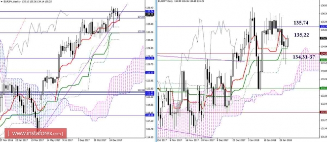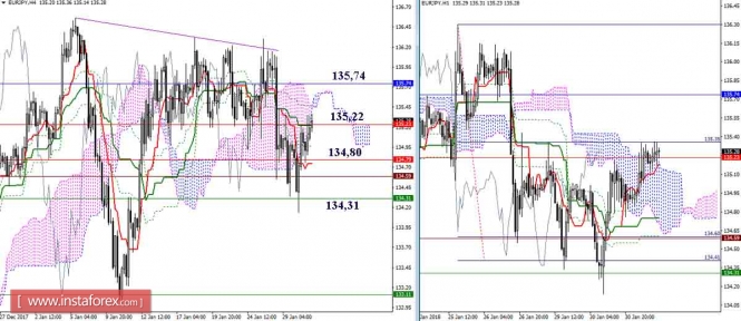 Дневной обзор GBP/JPY и EUR/JPY на 31.01.18. Индикатор ИшимокуИнстаФорекс - Instaforex, 7 лет назад GBP/JPY При тестировании наиболее важных поддержек данного участка (дневной Фибо Киджун 152,42 + недельный Тенкан 152,72) игроки на понижение ограничились лишь длинной нижней тенью и дневным отбоем от уровней. В настоящий момент пара находится в зоне коррекции. Медведям для усиления своих позиций и продолжения снижения по-прежнему необходима ликвидация дневного креста и преодоление поддержки недельного краткосрочного тренда (152,42-72). Задача быков сейчас заключается в возврате к тестированию сопротивлений месячного таймфрейма – Киджун 155,56 и Сенкоу Спан Б 156,32. Вчера пара сохранила свою работу в пределах облака Н4. Сейчас преимущества игроков на повышение ограничиваются облаками Ишимоку младших временных интервалов. Надёжное закрепление в бычьей зоне относительно облачности вернёт пару к тестированию сопротивлений более старших таймов (155,56 – 156,32). Планы игроков на понижение в сложившейся ситуации упираются в поддержки, среди поддержек сегодня можно отметить 153,81 – 153,11 – 152,42. EUR/JPY Взаимодействие с ключевыми поддержками (недельный Тенкан 134,31 + дневной Фибо Киджун 134,37) не принесло игрокам на понижение достойного результата. После формирования длинных нижних теней продолжаются попытки восстановить позиции игроками на повышение. В настоящий момент идёт работа с дневным краткосрочным трендом (135,22), но наиболее важное значение по-прежнему имеет месячный Сенкоу Спан А (135,74). Как и ожидалось, сила поддержек сформировала восходящую коррекцию. Сейчас игроки на повышение близки к восстановлению всех своих преимуществ на младших таймах, для этого им нужно преодолеть облака Н1 и Н4, а также ликвидировать крест Н4 (Киджун 135,22 + Фибо Киджун 135,47). Ключевые сопротивления младших таймов усилены сейчас месячным Сенкоу Спан А (135,74). Основные поддержки сохраняют сегодня своё расположение на 134,80 и 134,31. Параметры индикатора: все временные интервалы 9 – 26 – 52 Цвет линий индикатора: Тенкан (краткосрочный тренд) – красный, Киджун (среднесрочный тренд) – зелёный, Фибо Киджун – зеленый пунктир, Чинкоу – серый, облака : Сенкоу Спан Б (SSB, долгосрочный тренд) – синий, Сенкоу Спан А (SSA) – розовый. Цвет дополнительных линий: поддержки и сопротивления MN – синий, W1 – зелёный, D1 – красный, Н4 – розовый, Н1 – серый, горизонтальные уровни (не Ишимоку) – коричневый, трендовые линии – фиолетовый. Материал предоставлен компанией InstaForex - www.instaforex.com |