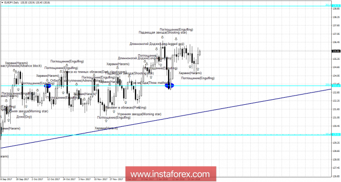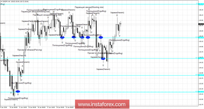 Свечной анализ EUR/JPY на 1 февраляИнстаФорекс - Instaforex, 7 лет назад 4h Пара EUR/JPY на 4-часовом графике выполнила небольшое падение после образования медвежьей формации «Харами». Бычья формация «Поглощение» сработала в пользу валюты ЕС и возобновления роста в направлении уровня коррекции 0,0% - 136,56. Образование 1 февраля новой медвежьей формации вновь позволит рассчитывать на разворот в пользу японской иены и некоторое падение в направлении коррекционного уровня 23,6% - 135,29. Закрепление курса пары под уровнем Фибо 23,6% повысит шансы на дальнейшее падение в направлении следующего уровня коррекции 38,2% - 134,50. Сетка Фибо построена по экстремумам от 20 ноября 2017 года и 5 января 2018 года. Daily На 24-часовом графике пара выполнила разворот в пользу европейской валюты, после образования бычьей формации «Поглощение», и начала процесс роста в направлении коррекционного уровня 261,8% - 139,05. Образование медвежьей формации позволит трейдерам ожидать разворот в пользу валюты Японии и некоторое падение в направлении уровня коррекции 200,0% - 133,32. Закрепление котировок под уровнем Фибо 200,0% повысит вероятность продолжения падения в направлении уровня коррекции 161,8% - 129,81. Сетка Фибо построена по экстремумам от 15 декабря 2016 года и 17 апреля 2017 года. Материал предоставлен компанией InstaForex - www.instaforex.com |