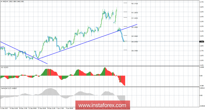 Технический анализ природного газа за 1 февраля 2018 годаИнстаФорекс - Instaforex, 7 лет назад 4-часовой таймфрейм Анализ: Цена на природный газ в среду, 31 января, продолжала нисходящее движение и снизилась к уровню поддержки S4 - 2,9700. Так как восходящая линия тренда была преодолена, то сейчас по инструменту нисходящая тенденция. Нисходящей линии тренда на данный момент нет и вряд ли она появится в ближайшее время. Если цена преодолеет уровень S4, то движение вниз сможет продолжиться с целью уровень поддержки S5. Разворот одного или обоих индикаторов наверх может просигнализировать о витке восходящей коррекции. Также индикаторы могут начать разряжаться, так как располагаются на своих минимальных позициях. Торговые рекомендации: По инструменту #NG сейчас рекомендуется рассматривать шорты с целью 2,7850. Стоп-лосс выставляется выше ближайшего уровня сопротивления. Рекомендуется выставить Stop Loss в зону безубытка при прибыльности сделки 800-1000 пунктов. Отскок цены от уровня 2,7850 или разворот вверх OsMA или Awesome (могут разряжаться) укажет на начало коррекции. На сегодня запланирован отчет Министерства Энергетики США по изменению запасов газа (15-30 GMT). Ордера на покупку потеряли свою актуальность. Помимо технической картины следует также учитывать фундаментальные данные и время их выхода. Пояснения к иллюстрациям: Awesome Oscillator – красные и зеленые бары в окне индикаторов. OsMA – серые бары в окне индикаторов. Линии тренда – синие линии. Уровни поддержки и сопротивления – красные горизонтальные линии.Материал предоставлен компанией InstaForex - www.instaforex.com |