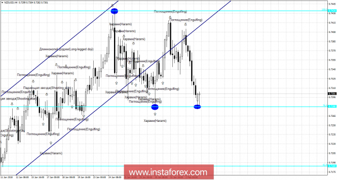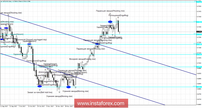 Свечной анализ NZD/USD на 5 февраляИнстаФорекс - Instaforex, 7 лет назад 4h Пара NZD/USD на 4-часовом графике выполнила падение к уровню коррекции 76,4% - 0,7280. Отбой котировок от уровня Фибо 76,4% позволил паре выполнить разворот в пользу валюты Новой Зеландии и начать процесс роста в направлении уровня коррекции 100,0% - 0,7434. Образование 5 февраля медвежьей свечной формации сработает в пользу доллара США и возобновления падения котировок. Закрепление пары под уровнем Фибо 76,4% аналогично позволит рассчитывать на продолжение падения котировок в направлении уровня коррекции 61,8% - 0,7184. Сетка Фибо построена по экстремумам от 31 августа 2017 года и 20 сентября 2017 года. Daily На 24-часовом графике медвежья свечная формация «Поглощение» позволила паре выполнить разворот в пользу валюты США и падение к уровню коррекции 38,2% - 0,7274. Отбой котировок от уровня Фибо 38,2% позволит ожидать разворот в пользу новозеландской валюты и некоторый рост в направлении коррекционного уровня 23,6% - 0,7382. Образование бычьей формации повысит шансы пары на отбой от уровня Фибо 38,2%. Закрепление котировок под уровнем коррекции 38,2% сработает в пользу дальнейшего падения в направлении следующего уровня Фибо 50,0% - 0,7188. Сетка Фибо построена по экстремумам от 11 мая 2017 года и 27 июля 2017 года. Материал предоставлен компанией InstaForex - www.instaforex.com |