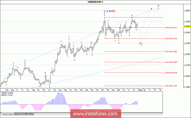Волновой анализ валютной пары EUR/USD за 5 февраля 2018 годаИнстаФорекс - Instaforex, 7 лет назад Анализ волновой разметки: После трехдневного роста, пятничные торги пара EUR/USD начала с нисходящего движения и, потеряв более 100 п.п., во второй половине дня откатилась к отметке 1,2410. Сложившаяся при этом волновая ситуация позволяет предполагать, что валютная пара может значительно усложнить внутреннюю волновую структуру 4-й волны, в 5-й, в 3-й, в 5-й, в А, в (С), продолжив обозначившееся снижение в направлении уровня 23-й фигуры. В то же время в сложившихся условиях валютная пара может в любой момент возобновить рост котировок, как минимум к уровню 1,2600. Цели для построения нисходящей волны: 1,2224 – 38,2% по Фибоначчи 1,2127 – 50,0% по Фибоначчи Цели для построения восходящей волны: 1,2500 – 1,2600 Общие выводы и торговые рекомендации: Продолжается построение повышательной волны А, в (С), внутренняя разметка которой продолжает усложняться. Предполагаемая волна 3, в 5, в А, в (С) усложнила свою внутреннюю волновую структуру и возобновила свое построение с целями, расположенными около 26 фигуры. Коррекционная волна 4 получилась весьма укороченной, но может усложнить свою внутреннюю структуру с целями, находящимися около отметок 1,2344 и 1,2224, что приравнивается к 38,2% и 50,0% по Фибоначчи.Материал предоставлен компанией InstaForex - www.instaforex.com |