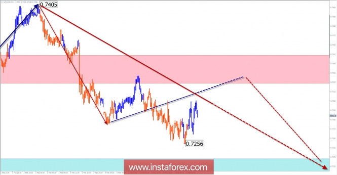 Торговый обзор на 6 февраля по упрощенному волновому анализуИнстаФорекс - Instaforex, 7 лет назад Обзор и прогноз по USD/JPY Боковой вектор ценовых колебаний курса мажора японской валюты объясняется коррекционным характером доминирующей волны. На протяжении прошедшего года экстремумы цены сформировали фигуру «нисходящий треугольник». Предварительный расчет целевого участка дает ориентир в виде зоны между 104-ой и 106-ой ценовой фигурой. В районе ближайшей зоны потенциального разворота сохраняется вероятность продолжения встречного отката, в виде восходящего волнового зигзага. Сегодня, на ближайшей сессии, можно ждать кратковременный подъем ценовых котировок пары. Наиболее вероятным участком завершения отката остается зона сопротивления. Ближе к концу дня возрастает вероятность возврата к основному направлению движения. Границы зон сопротивления: - 109.20/50 Границы зон поддержки: - 108.40/10 Обзор и прогноз по NZD/USD Анализ структуры последней долгосрочной волновой модели, с августа 2015 года, дает объяснение краткосрочным трендам инструмента. Можно констатировать завершение первых 2-х частей восходящей волны. Последний восходящий участок от 17 ноября прошлого года дал начало завершающей части (С) основного тренда. В последние 2 недели цена во флете корректирует предыдущий ценовой рост. Ближайший участок графика, где можно ждать завершение текущей коррекции, находится примерно в 2-х ценовых фигурах ниже текущей цены инструмента. Основным направлением ближайших торговых сессий должно стать снижение курса пары. На европейской сессии не исключен кратковременный ценовой подъем, не далее расчетного сопротивления. Границы зон сопротивления: - 0.7320/50 Границы зон поддержки: - 0.7240/10 Пояснения к рисункам: Для упрощенного волнового анализа используется простейший вид волны в виде зигзага, сочетающий в себе 3 части (А;В;С). Из таких волн состоят все виды коррекции и большая часть импульсов. На каждом тайм-фрейме анализируется последняя, незавершенная волна. Отмеченные на графиках зоны указывают расчетные участки, где вероятность смены направления движения значительно повышается. Стрелки указывают волновую разметку по используемой автором методике. Сплошным фоном стрелок указана сформированная структура, пунктирным – ожидаемые волновые движения. Внимание: Волновой алгоритм не учитывает продолжительность движений инструмента по времени. Прогноз не является торговым сигналом! Для проведения торговой сделки требуются подтверждающие сигналы используемых Вами торговых систем. Материал предоставлен компанией InstaForex - www.instaforex.com |