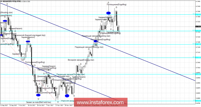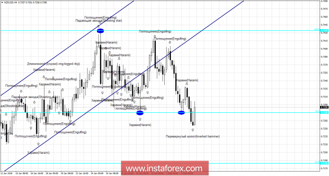 Свечной анализ NZD/USD на 6 февраляИнстаФорекс - Instaforex, 7 лет назад 4h После образования на 4-часовом графике медвежьей формации «Харами» пара NZD/USD выполнила разворот в пользу доллара США и закрепление под уровнем Фибо 76,4% - 0,7280. Бычья формация «Перевернутый молот» позволяет трейдерам рассчитывать на разворот в пользу новозеландской валюты и некоторый рост пары. Закрепление курса 6 февраля над уровнем коррекции 76,4% сработает в пользу продолжения роста в направлении коррекционного уровня 100,0% - 0,7434. Образование медвежьей формации сработает в пользу возобновления падения в направлении уровня Фибо 61,8% - 0,7184. Сетка Фибо построена по экстремумам от 31 августа 2017 года и 20 сентября 2017 года. Daily На 24-часовом графике медвежья свечная формация «Поглощение» позволила паре выполнить разворот в пользу валюты США и падение к уровню коррекции 61,8% - 0,7261. Отбой котировок от уровня Фибо 61,8% позволит ожидать разворот в пользу валюты Новой Зеландии и некоторый рост в направлении коррекционного уровня 76,4% - 0,7373. Образование бычьей формации повысит шансы пары на отбой от уровня Фибо 61,8%. Закрепление котировок под уровнем коррекции 61,8% сработает в пользу продолжения падения в направлении следующего уровня Фибо 50,0% - 0,7169. Сетка Фибо построена по экстремумам от 27 июля 2017 года и 17 ноября 2017 года. Материал предоставлен компанией InstaForex - www.instaforex.com |