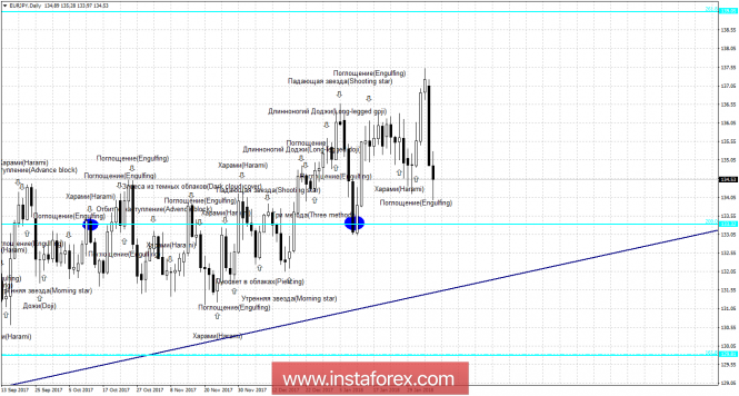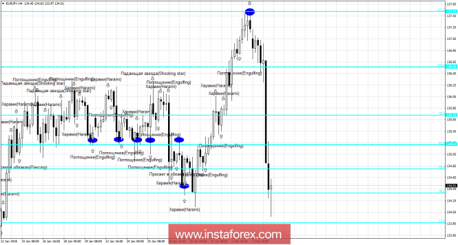 Свечной анализ EUR/JPY на 6 февраляИнстаФорекс - Instaforex, 7 лет назад 4h Пара EUR/JPY на 4-часовом графике, после образования медвежьей свечной формации «Поглощение» и отбоя от уровня коррекции 127,2% - 137,52, выполнила разворот в пользу японской валюты и падение к уровню Фибо 38,2% - 134,39. Отбой пары от уровня коррекции 38,2% позволит трейдерам рассчитывать на разворот в пользу европейской валюты и некоторый рост в направлении коррекционных уровней 50,0% - 134,80 и 61,8% - 135,22. Образование 6 февраля бычьей свечной формации повысит шансы пары на отбой от уровня Фибо 38,2%. Закрепление котировок под уровнем коррекции 38,2% повысит вероятность дальнейшего падения в направлении уровня Фибо 23,6% - 133,87. Сетка Фибо построена по экстремумам от 5 января 2018 года и 11 января 2018 года. Daily На 24-часовом графике пара, без образования медвежьей свечной формации, выполнила разворот в пользу валюты Японии и начала падение в направлении коррекционного уровня 200,0% - 133,32. Образование бычьей формации позволит рассчитывать на разворот в пользу евровалюты и возобновление процесса роста в направлении уровня коррекции 261,8% - 139,05. Отбой котировок от уровня Фибо 200,0% аналогично сработает в пользу начала роста пары. Закрепление курса под уровнем Фибо 200,0% повысит вероятность дальнейшего падения в направлении следующего уровня коррекции. Сетка Фибо построена по экстремумам от 15 декабря 2016 года и 17 апреля 2017 года. Материал предоставлен компанией InstaForex - www.instaforex.com |