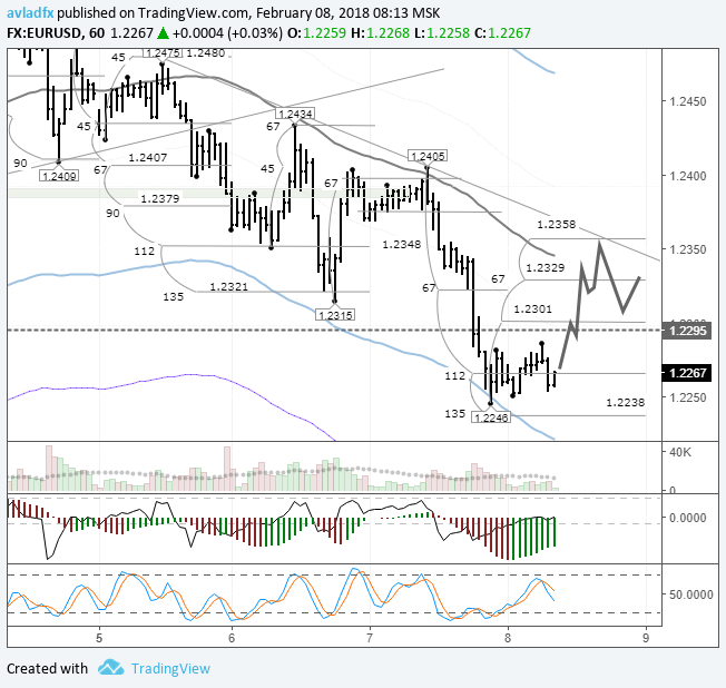 Курс евро скатился в разворотную зону 112 – 135 гр.Владислав Антонов - Альпари, 7 лет назад Итоги минувшего торгового дня: В среду, 7 февраля, торги по евро завершились снижением. Пара евро/доллар снизилась с 1,2405 до 1,2246 (-159 п.). Драйверами для укрепления доллара США стали рост доходности американских облигаций и продление финансирования правительства до 23 марта. А нисходящее ускорение придал обвал кросс евро/фунт. Запланированная статистика (GMT +3): В 10:00 Германия опубликует сальдо торгового баланса и сальдо платежного баланса за декабрь. В 12:00 еврозона представит экономический бюллетень от ЕЦБ. В 17:00 Банка Англии огласит решение по основной процентной ставке, объему покупок активов. Выйдет отчет по инфляции и выступит Карни. В 16:30 США опубликует число первичных обращений за пособием по безработице.