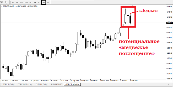 Свечной анализ пары GBPUSD от 08.02.2018Veselin Petkov - Альпари, 7 лет назад На недельном таймфрейме (W1) в паре GBPUSD может произойти разворот (схожая ситуация формируется в паре ЕURUSD). Вероятность разворота GBPUSD значительно увеличится, если в конце текущей недели GBPUSD закроется ниже отметки 1,3848. Таким образом, на свечном недельном графике произойдет «медвежье поглощение» - классическая разворотная свечная модель: