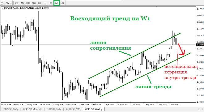 Все-таки хочу напомнить, что на W1 пара GBPUSD продолжает находиться внутри восходящего тренда:
