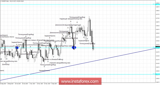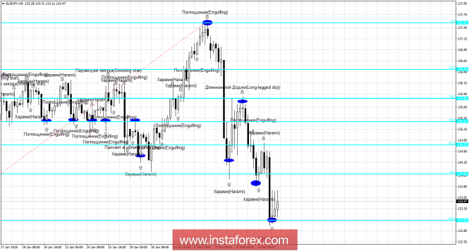Свечной анализ EUR/JPY на 9 февраляИнстаФорекс - Instaforex, 7 лет назад 4h Пара EUR/JPY на 4-часовом графике, после образование медвежьей формации «Харами», выполнила разворот в пользу валюты Японии и падение к коррекционному уровню 100,0% - 133,03. Отбой котировок от этого уровня Фибо и бычья формация «Харами» сработали в пользу валюты ЕС и начался процесс роста в направлении уровня коррекции 76,4% - 134,09. Образование 9 февраля новой медвежьей формации вновь позволит рассчитывать на разворот в пользу валюты Японии и возврат к уровню Фибо 100,0%. Закрепление курса под уровнем коррекции 100,0% повысит шансы пары на продолжение падения в направлении уровня Фибо 127,2% - 131,81. Сетка Фибо построена по экстремумам от 11 января 2018 года и 2 февраля 2018 года. Daily На 24-часовом графике пара выполнила падение к уровню коррекции 200,0% - 133,32. Образование бычьей свечной формации позволит трейдерам ожидать разворот в пользу евровалюты и некоторый рост в направлении уровня Фибо 261,8% - 139,05. Отбой котировок от уровня коррекции 200,0% аналогично сработает в пользу начала роста пары. Закрепление пары под уровнем Фибо 200,0% повысит вероятность дальнейшего падения в направлении следующего коррекционного уровня 161,8% - 129,81. Сетка Фибо построена по экстремумам от 15 декабря 2016 года и 17 апреля 2017 года. Материал предоставлен компанией InstaForex - www.instaforex.com |
