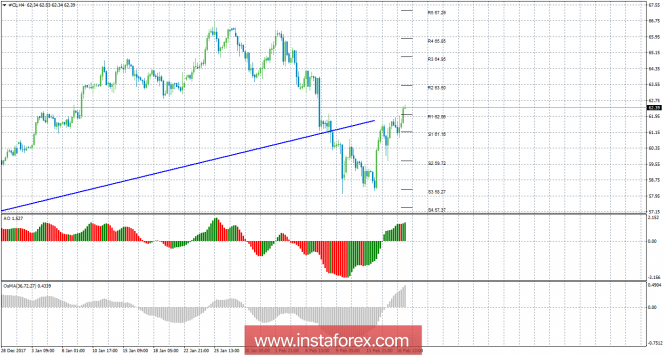 Технический анализ сырой нефти за 16 февраля 2018 годаИнстаФорекс - Instaforex, 7 лет назад 4-часовой таймфрейм Анализ: В пятницу, 16 февраля, котировки «черного золота» продолжали корректироваться против нисходящей тенденции, образовавшейся после преодоления восходящей линии тренда. Нисходящей линии тренда на данный момент нет. Отчет Baker Hughes в пятницу показал прирост еще 7 единиц активных нефтяных платформ в США. Однако это не помешало активу продолжить восстанавливаться после падения с максимумов около 66,00. Уровень сопротивления R1 уже преодолен, поэтому движение вверх может продолжиться сегодня. Торговые рекомендации: В ходе проведенного анализа движения цены на нефть, можно сделать вывод, что сейчас можно рассматривать ордера на продажу с целями 59,72 и 58,27. Стоп-лосс выставляем выше ближайшего уровня сопротивления. При заходе сделки в прибыльность 80-130 пунктов, рекомендуется переносить открытую сделку в безубыток. Закрепление ниже уровня 61,16 может указать на возобновление движения вниз. В понедельник не будет никаких важных публикаций, касающихся нефти. Длинные позиции сейчас не актуальны. Помимо технической картины следует также учитывать фундаментальные данные и время их выхода. Пояснения к иллюстрациям: Awesome Oscillator – красные и зеленые бары в окне индикаторов. OsMA – серые бары в окне индикаторов. Линии тренда – синие линии. Уровни поддержки и сопротивления – красные горизонтальные линии.Материал предоставлен компанией InstaForex - www.instaforex.com |